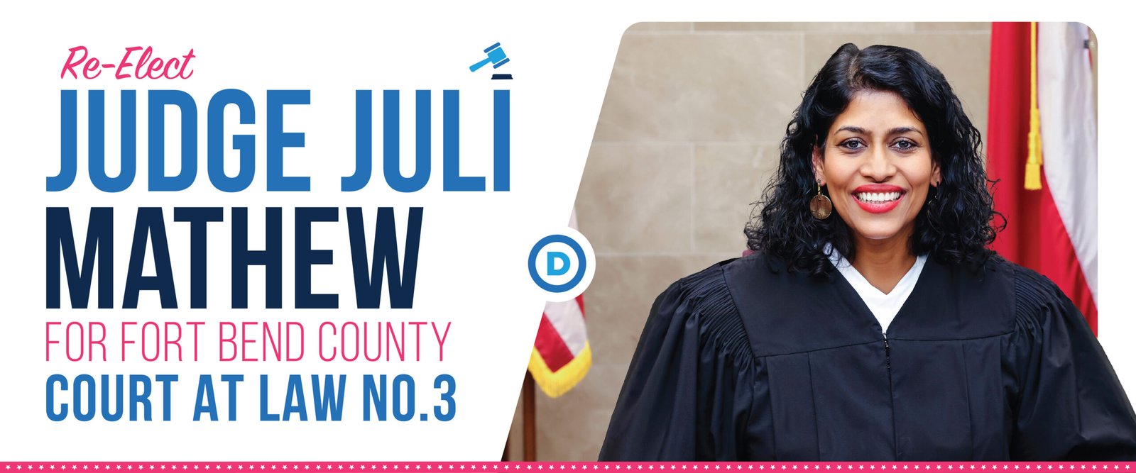 Judge Mathew made history as the first Indian American woman elected to the bench in the United States and the first Asian American woman elected in Fort Bend County. A proud resident for over two decades, she embraces her immigrant roots from Kerala, India, and is fluent in Malayalam and English.